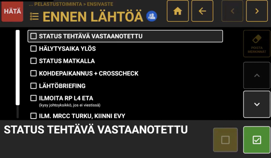 Tarkistuslistasovellus tarjoaa päivitettävät sähköiset tarkistuslistat ihmislähtöisen toiminnan tukemiseksi ja yhdenmukaistamiseksi. Sovellus tuottaa paitsi mobiililaitteissa toimivat listat myös tulostevihkon, joka on käytettävissä ilman teknisiä laitteita.